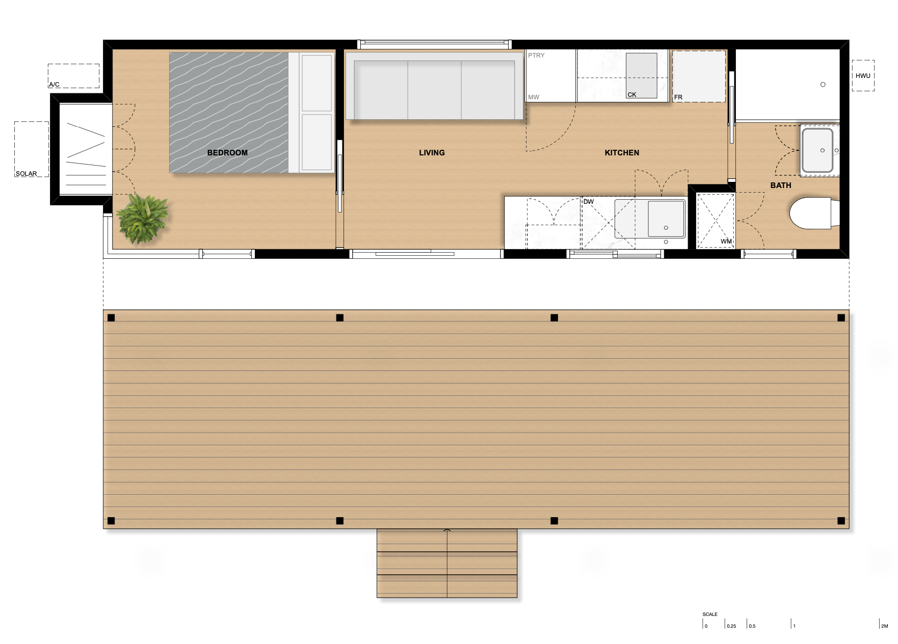 A spacious yet compact single-storey tiny home, designed with a private bedroom, full height ceilings and an overall sense of luxury spaciousness.